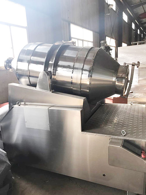 本机混合筒在转动的同时又参加与摆动,使筒中物料得以充分混合。混合筒的出料口偏离混合筒圆筒部分的中心线,使该机具有混合迅速、混合量大、出料便捷等特点。