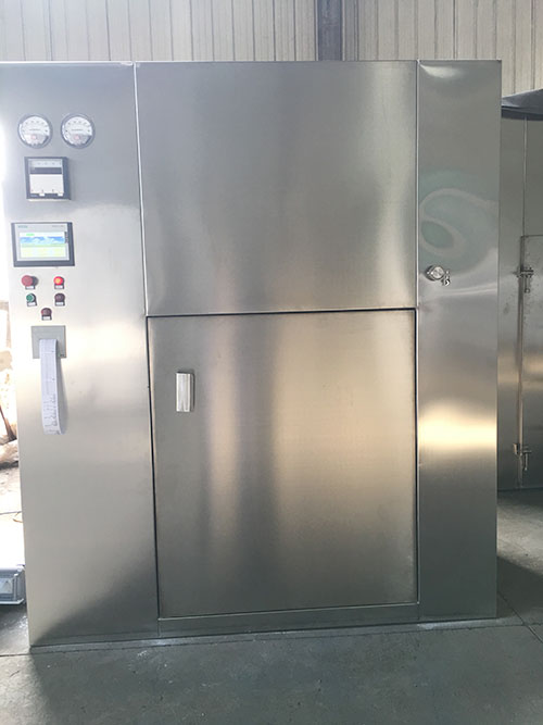 ⒋ 工作原理:将装满物料的烘盘、瓶子或小车放入箱内,启动PLC可编程序控制系统,内循环风机工作、加热、蝶阀同时开启、干燥箱迅速升温。在内循环风机作用下,于热空气通过耐高温过滤器进入箱体,在微孔调节作用下形成一个均匀分布空气向箱体内传递,干燥空气吸收瓶子(物料、物品)表面的水分,进入加热通道蒸发排出、干空气在风机作用下定向循环流动,水蒸汽排出。随着水蒸汽逐渐减少、同时间隙性补充新鲜过滤空气,箱体内呈微正压状态,恒温结束,过程控制完毕。开启送风或(进水)强制冷却,自动蝶阀进入关闭状态,声光提示开门出瓶。